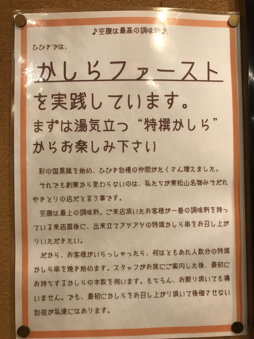焼き鳥で有名になってる東松山でも人気のあるひびき庵さん。入店してから知りましたが、こちらでは『かしらファースト』を実施しているそうです。説明を読むとなにわともあれ入店された人の人数分の特選かしらをオーダーなくとも焼き始めるそうです。それだけ自信があるとのこと!もちろんそんなことは知らずとも特選かしらは注文しました。自家製みそだれを付けて食べるのも良いです。