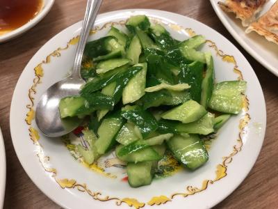 餃子はどれもパリパリで美味しいし、たたきキュウリもあっさり塩味で美味。