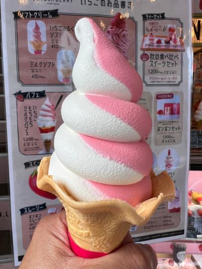 苺飴、そしていちごみるくソフトクリームを食べましたが、このソフトクリームが本当にいちごみるく味で甘くて美味しかったです。