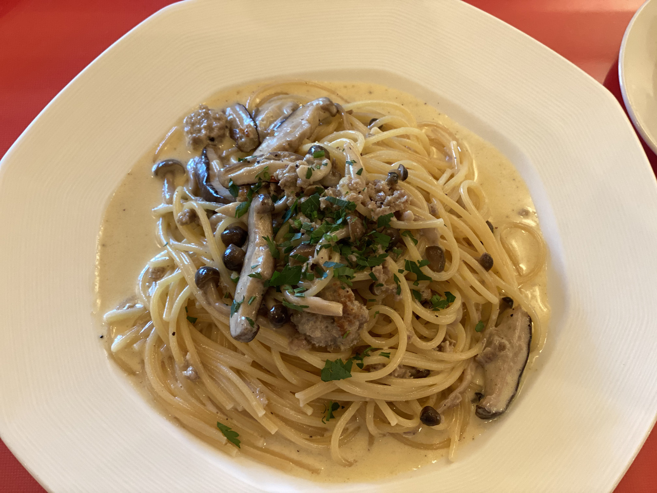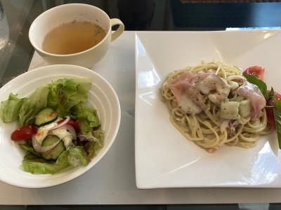 ランチで季節のパスタをいただきました。バジルの香りが良く効いたクリーム系のパスタでした。