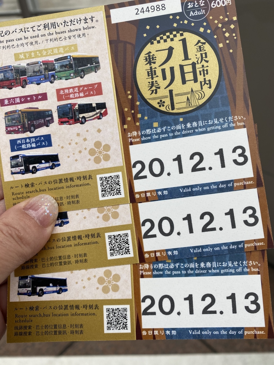 金沢市内の観光には欠かせない周遊バス。一日乗車券は大人600円。一回の乗車の場合は200円なので、3回乗れば元が取れます。