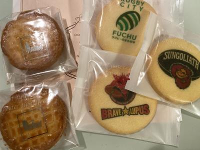 府中はラグビートップリーグの東芝とサントリーの本拠地であるため、ラグビーの街らしく、両リームのマスコットがプリントされたラグビーサブレ、アーモンドのラグビーチョコがあります。