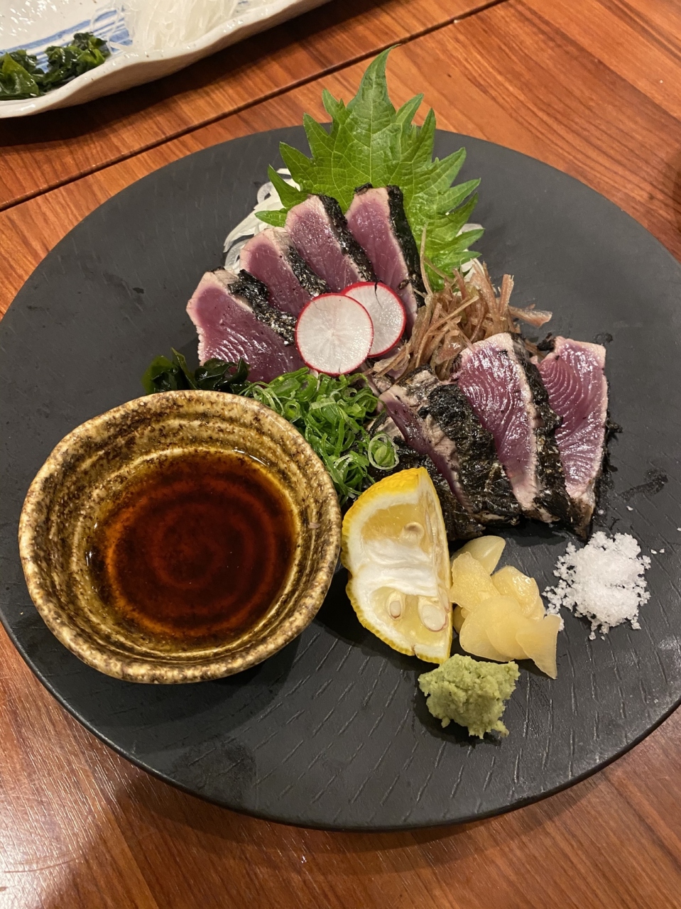 先ずは楽しみにしていたカツオのタタキ。本場高知なので美味しいとは思っていましたが、塩でいただく松葉で炙られたカツオはこんなにも違うの?と思えるほど本当に美味しい物でした。