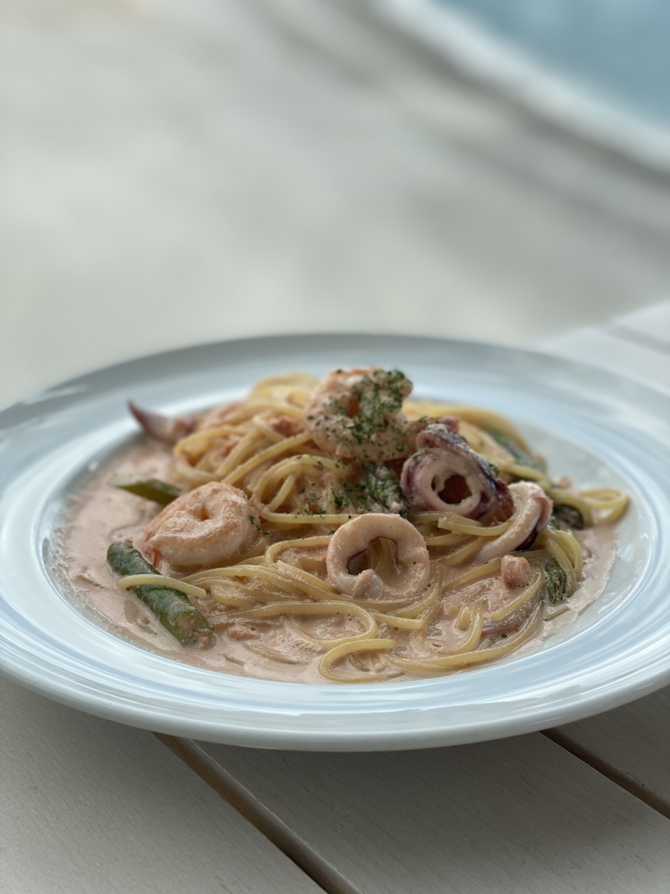 お天気が良かったこともあり想像通り絶景の見れる素敵なカフェでランチをいただきましたが、パスタもとても美味しかったです。