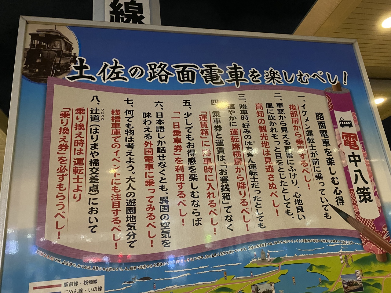 高知駅前の乗り場の前には「土佐の路面電車を楽しむべし」として路面電車を楽しむ心得『電中八策』が書かれてありました。なかなか面白いことが書いてあります。