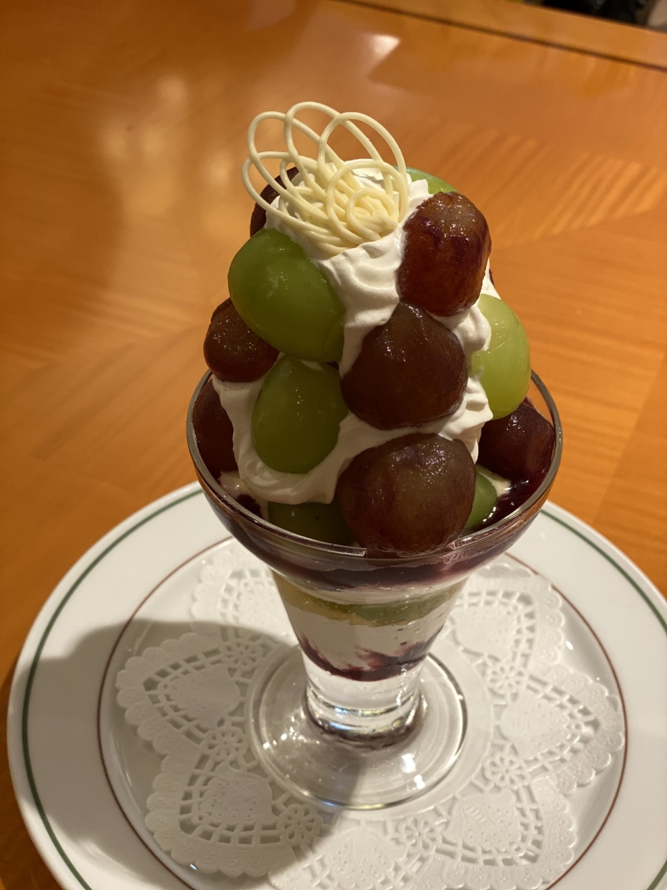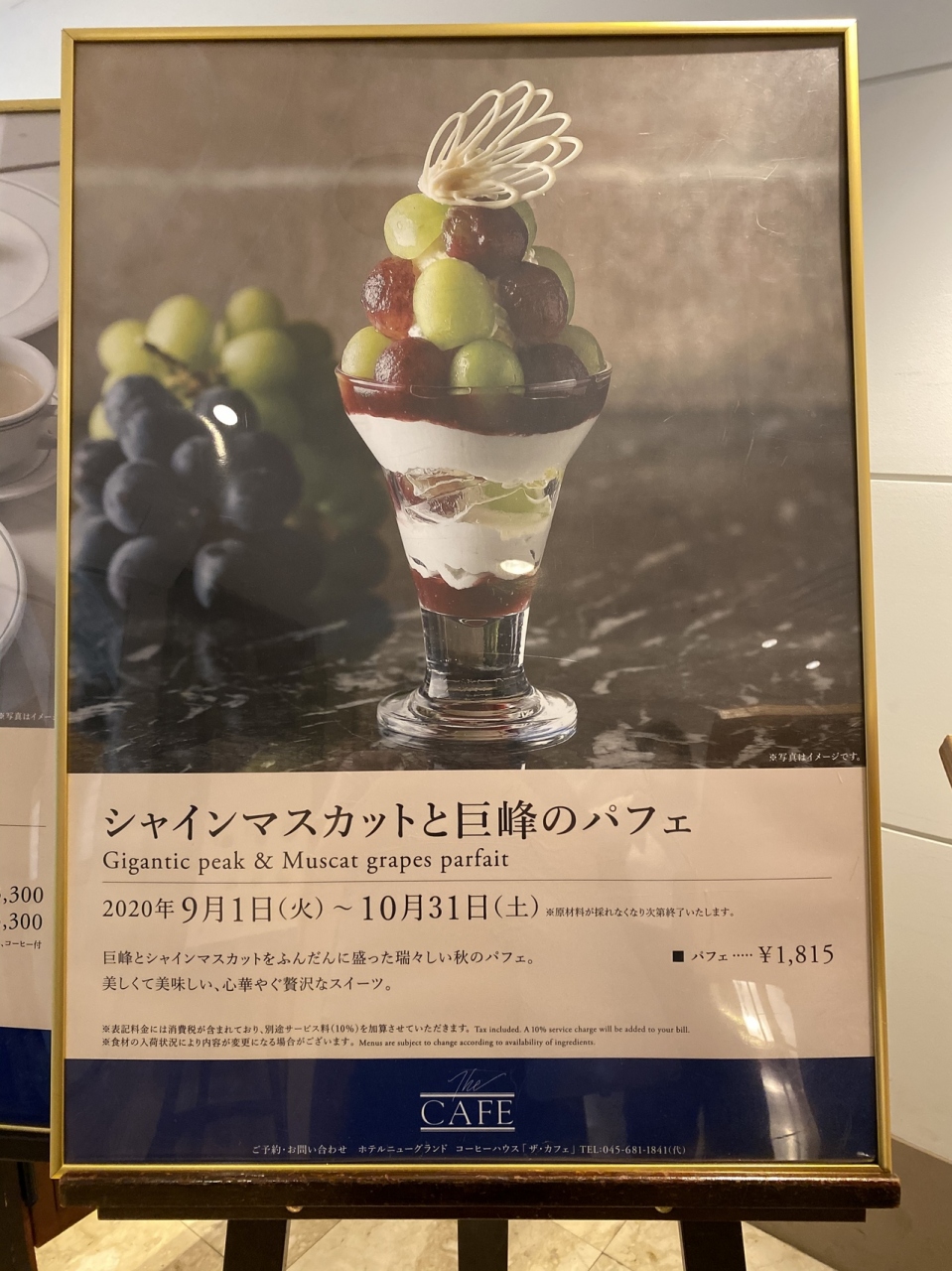 横浜、ホテルニューグランドの一階にあるザ・カフェでとても美味しそうなパフェを見つけました!10月31日までの期間限定、シャインマスカットと巨峰のパフェです。