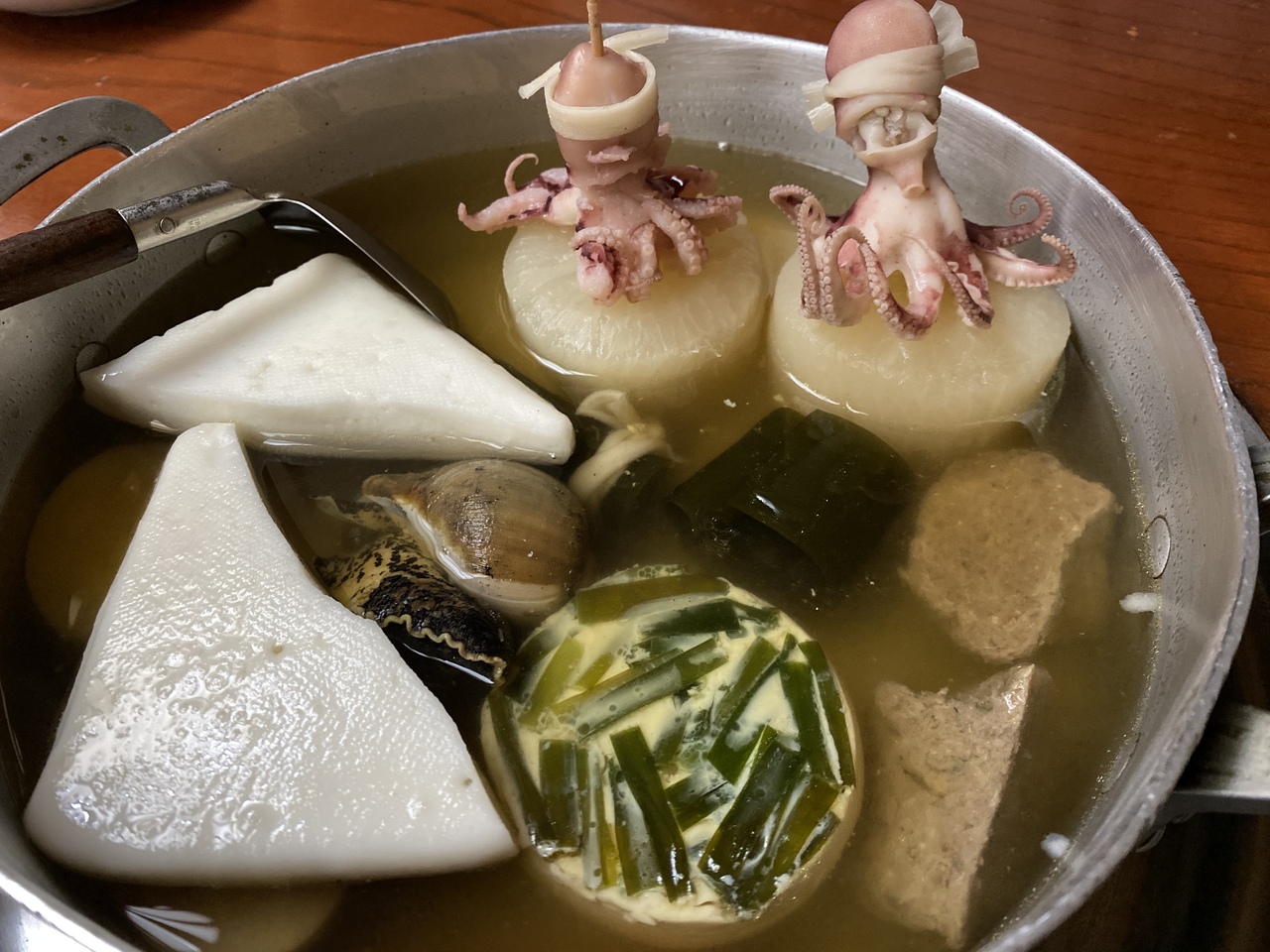 おでんではニラ玉を食べましたが、茶わん蒸しを固めにしたような感じでした。珍しいですね。イイダコも程よい硬さが残った程度に煮込まれていて、どちらも美味しかったです。