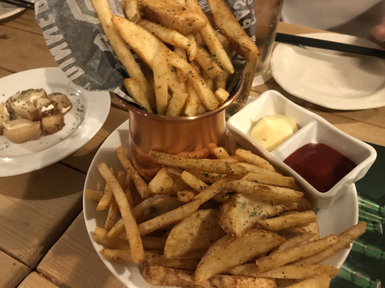 お料理はほとんど一品ずつ、ピザ、ニョッキ、フライドポテト、砂肝の唐揚げ、チキンの香草焼きに黒毛和牛、それに焼きそばなどなど食べてみました。たくさんオーダーしましたが、どれもハズレなく美味しかったです。
