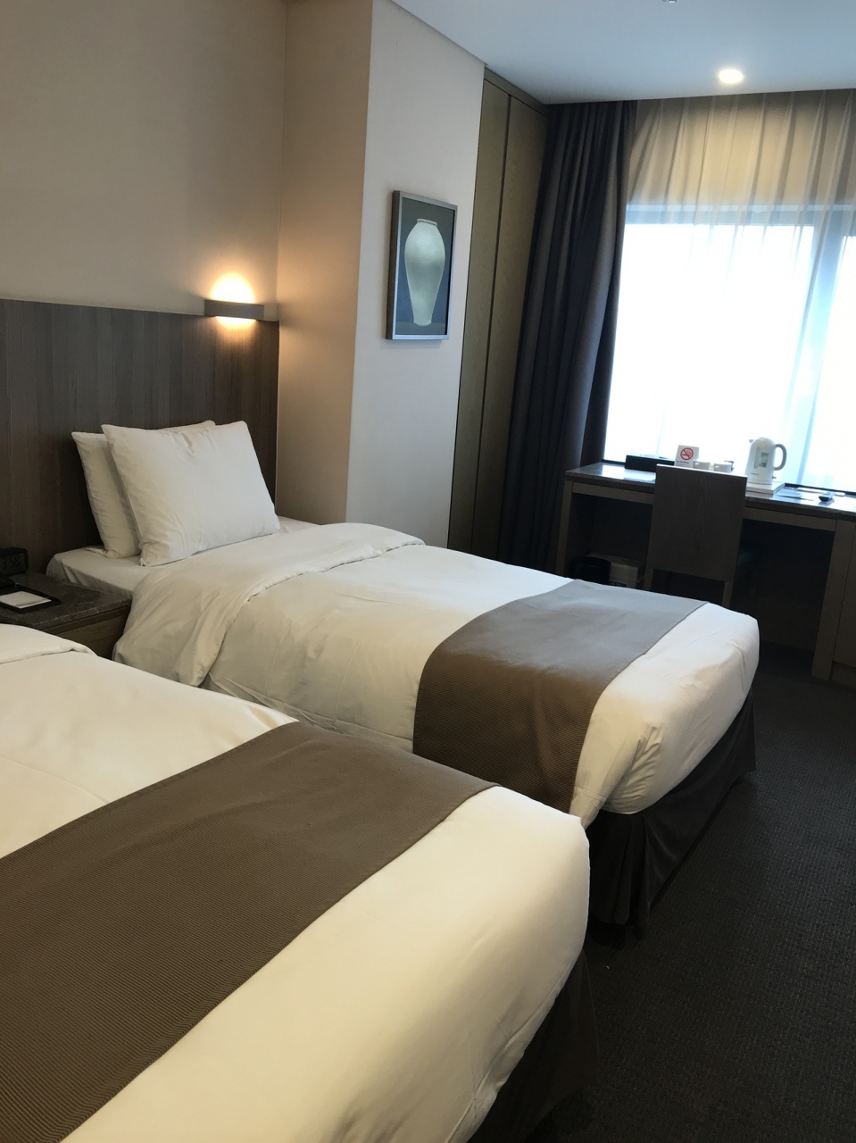 地下鉄1号線、鍾閣駅が最寄りのホテル。ツインに宿泊。部屋自体はそれほど広くありませんが、綺麗で浴槽あり、シャワートイレです。