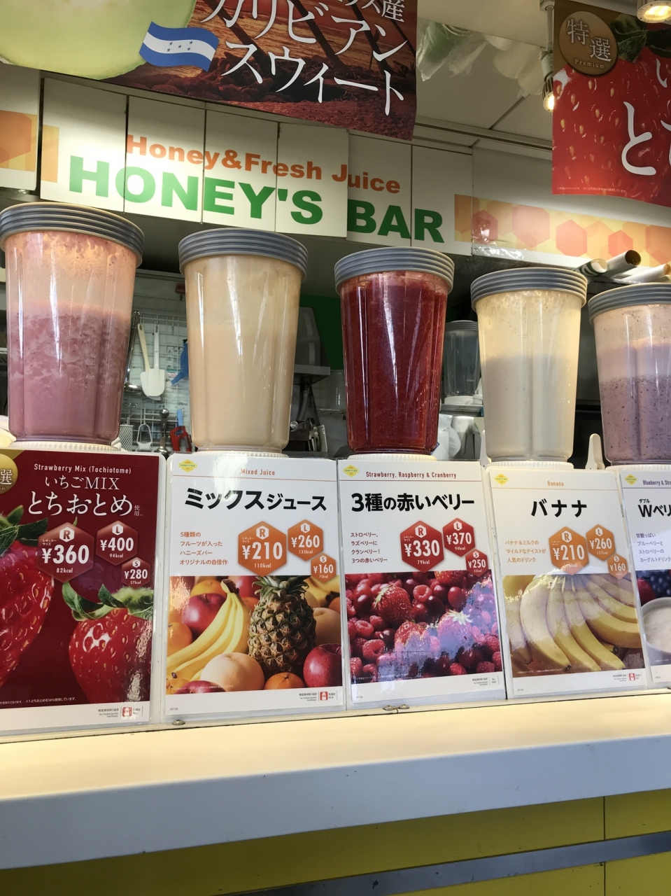 山手線池袋駅、電車降りたらホームにあるジュースバー。喉が渇いていても電車の中では飲みにくい、そんな時にとても便利。サイズはS.M.Lとあります。季節によりジュースの種類も変わります。手軽に冷たいジュースが飲めるので良いです。