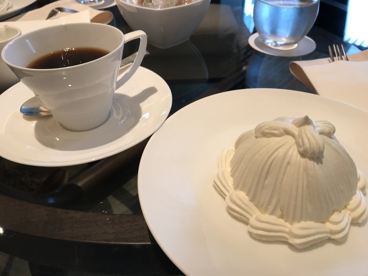 パレスホテル東京のロビーラウンジ。日曜日のお昼過ぎに行き、2,30分待ちました。お目当てはマロンシャンティイです。生クリームは軽くあっさりとした美味しさでした。コーヒーはお願いせずとも注いでもらえます。外のテラス席には暖房がありました。テーブルチェックです。