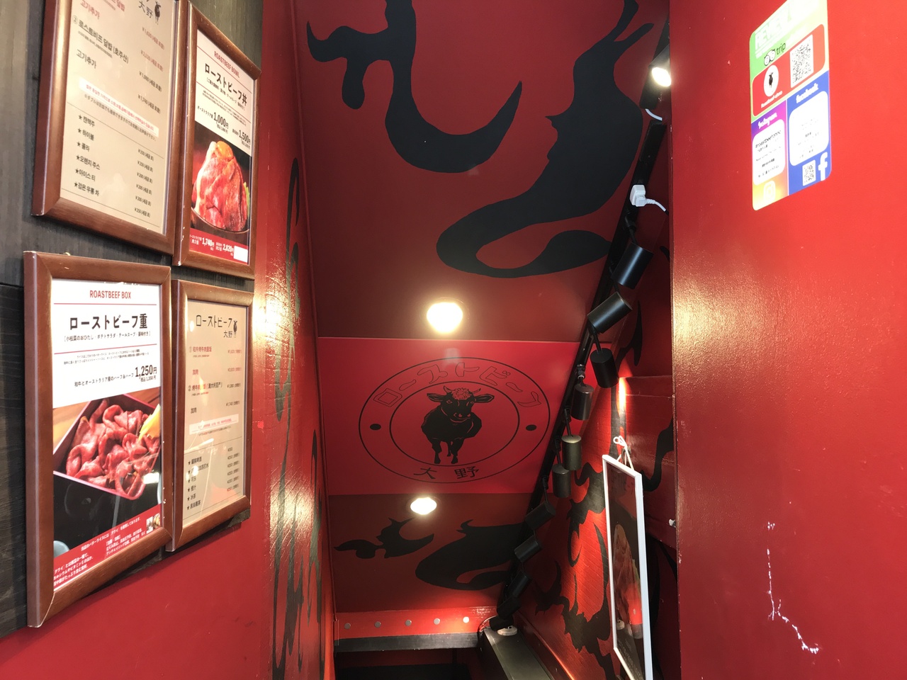 池袋駅東口、徒歩7、8分ほど、飲食店がたくさん並ぶ中、地下にあります。そのため知らなければ通り過ぎてしまうような場所ですが赤く大きな看板でローストビーフがアピールされています(^^)