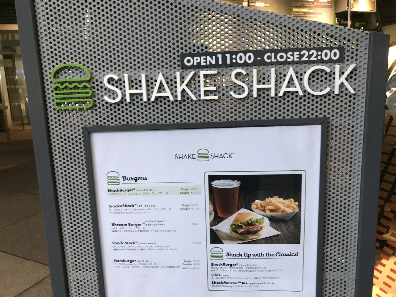 超人気店のシェイクシャックなのでいつも行列が出来ていると言うイメージ。実際にそうなのでなかなか並ぶ気にはなれず食べる機会がありませんでしたが、先日平日のコンサートの前に時間があったので寄ってみました。満席に近い状態ではあったものの座れたので初めて食べてみました。