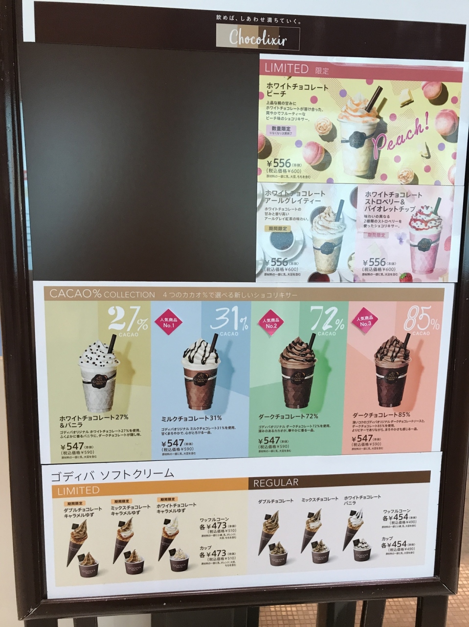 ゴディバと言えばチョコレートですが、オススメはチョコレートドリンクのショコリキサー。季節により限定商品もあります。