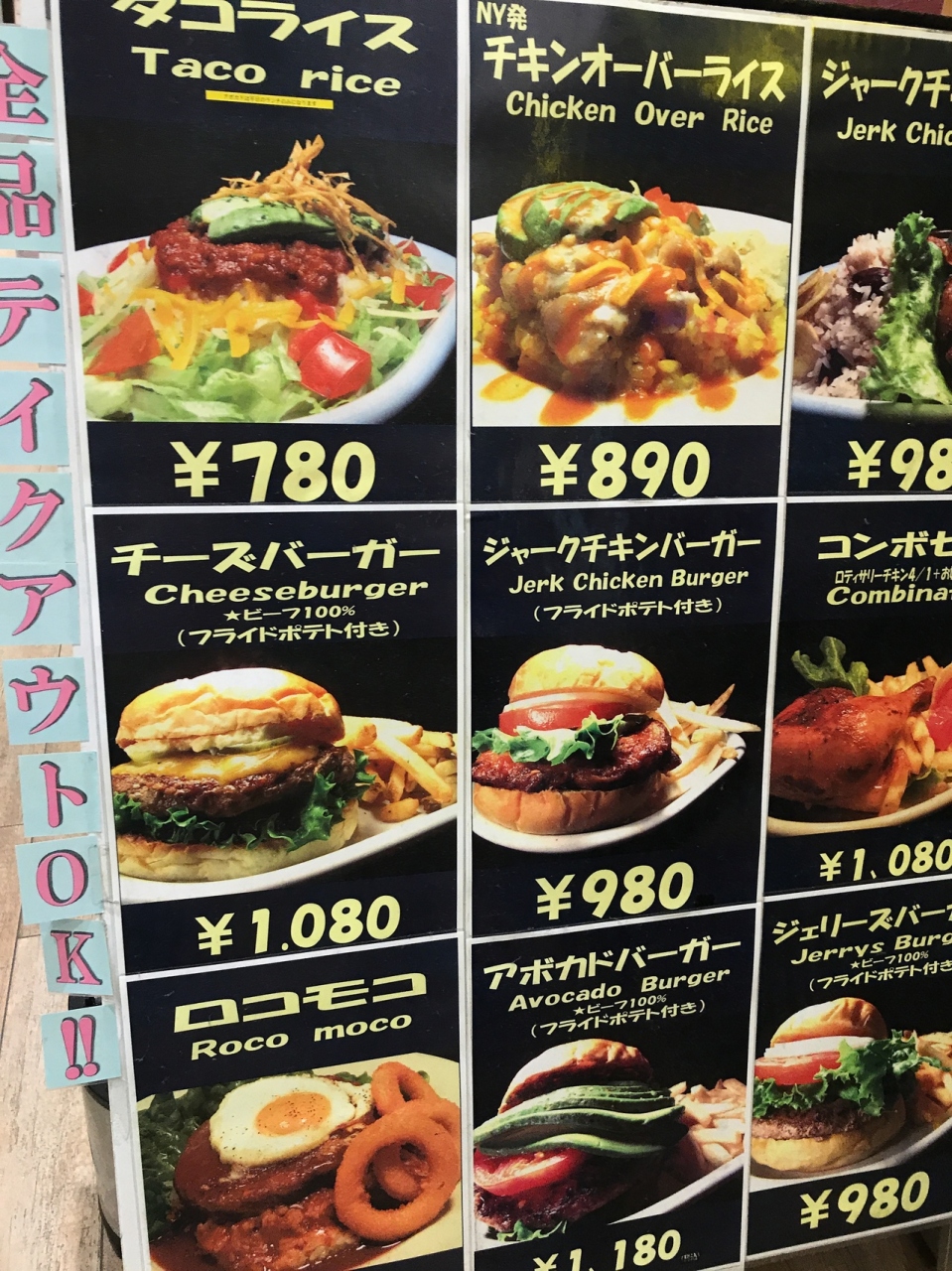 食べ物はハンバーガーを中心にロコモコやタコライス、チキン料理もあります。