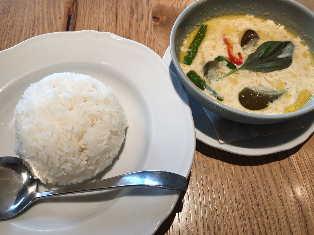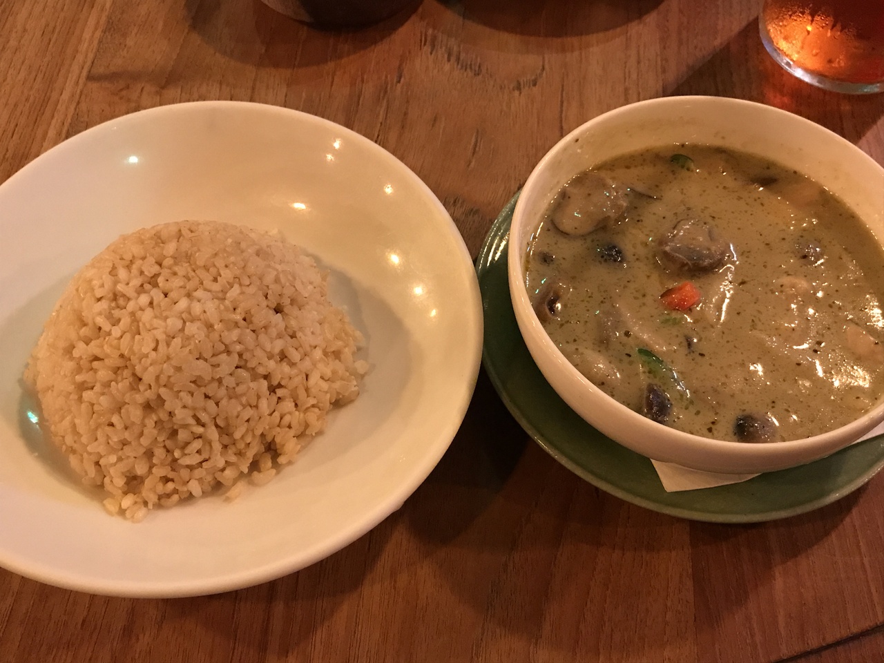食事の方は飲み物やデザートまで付いたお得なセットを頂きました。私はメインをグリーンカレーにしましたが程よい辛さで美味しかったです。ライスは白米、玄米、タイ米から選択出来ます。