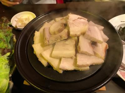 4人で行ったので豚足とポッサム、それにチーズじゃがいもチヂミをオーダー。