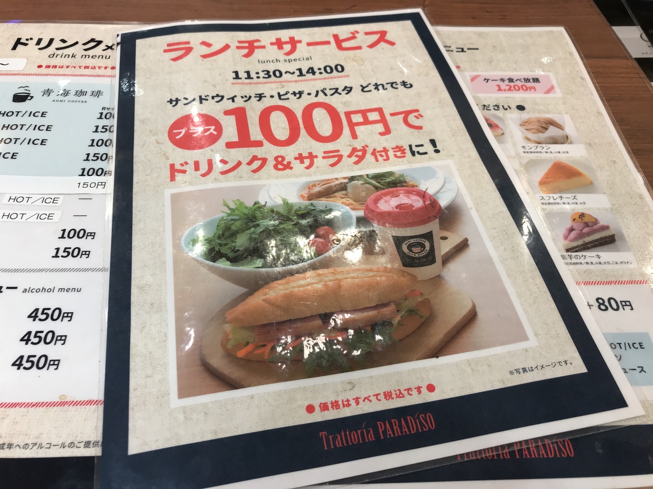 ランチはサンドウィッチやパスタ、ピザがあり、100円プラスでミニサラダとドリンクが付きお得!