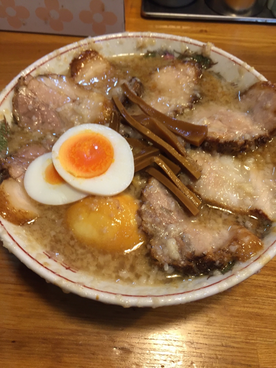もう数十年も前のことですが(⌒_⌒;『環七ラーメン』と呼ばれ行列が出来るお店でとても有名だった『土佐っ子ラーメン』それと同じように豚の背脂がこれでもか!ってくらい乗ってギトギトしてるラーメン。スープを全部飲み干すのはキツイと思われますが、クセになるのもわかります。