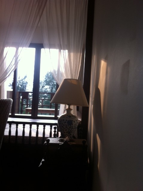 あちこちにバリ風の家具が置いてある、雰囲気のあるホテルです。目の前の月が浜の夕日は圧巻。