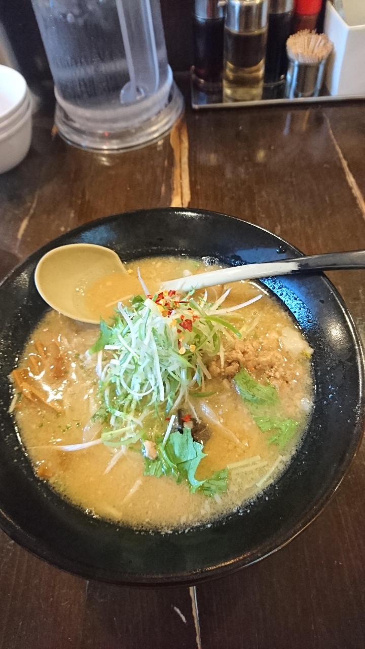 一度食べてみたかったみそラーメンを注文しました。みそラーメンにはこちらの意思に関係なく大量のおろしにんにくが乗っかってきます。あと、お願いすると豆板醤がもらえます。