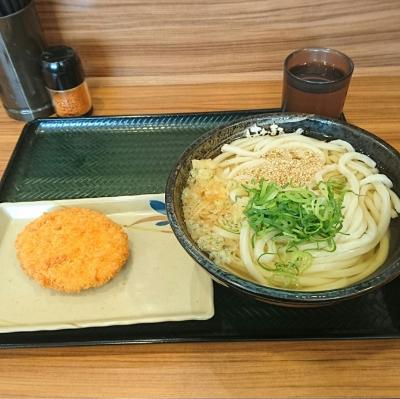 かけうどんの大とコロッケを注文しました。「はなまるうどん」で食べるときは、かけうどんを「まま」と注文すると、うどんを湯につけないで、茹でうどんをそのままドンブリに入れてもらえます。結構いけます。- 旅行時期