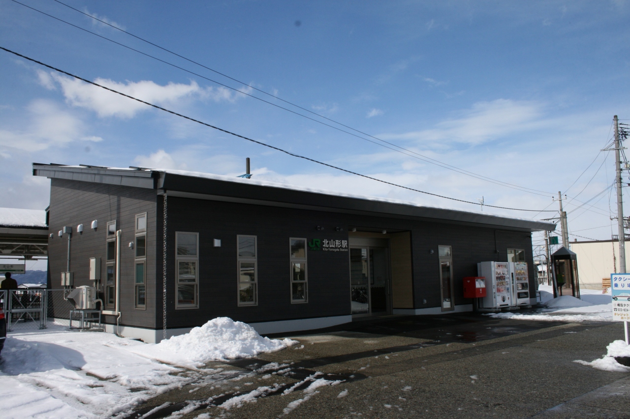 JR米坂線の駅。駅員がおり、待合室もあり、タクシーも止まっています。
