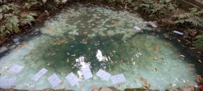 和紙を購入し、池に10円玉を置いていつ沈むかといったかたちです。