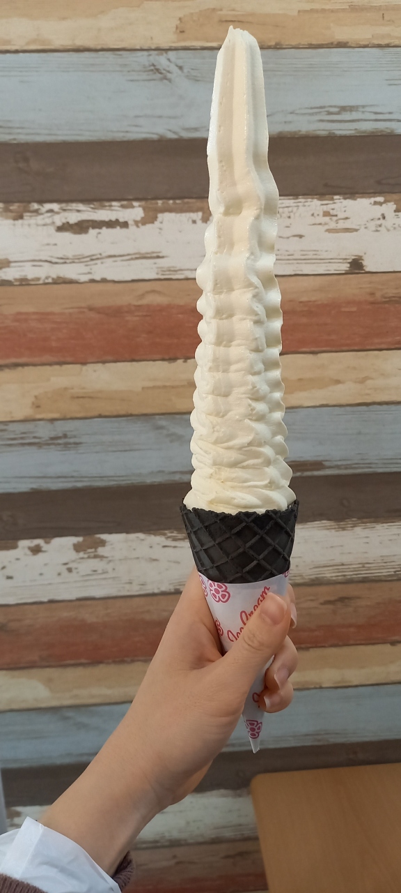 食べ方のコツは、ソフトクリームを体に近づけることだそうです。