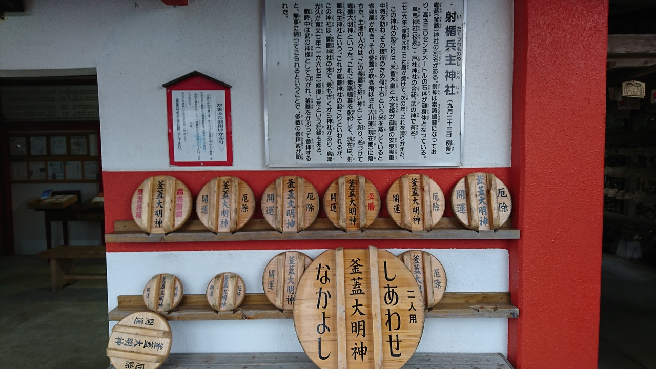 神社に置かれてある釜蓋を頭にのせて、鳥居まで歩けたらいいことがあるそうです。