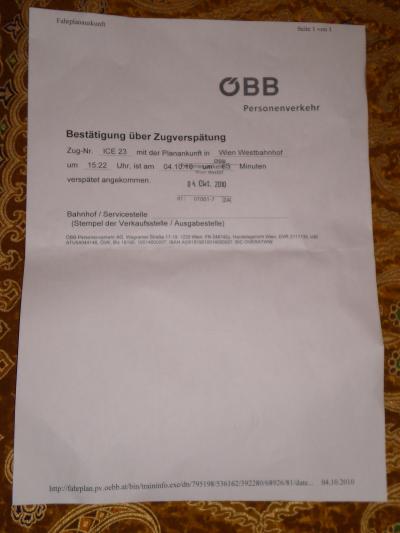 DBは昨年より列車の延着補償が法律化されています。60分を遅れると15%、120分を遅れると50%戻るようになりました。 列車が遅れますとその車内で利用列車が最後の目的地になる場合は乗車券を見せ、専務車掌から申請用紙を受け取ってください。今回はブダペスト行きの為、乗り継ぎ駅(ウィーン西駅)で発行をしてもらいました。