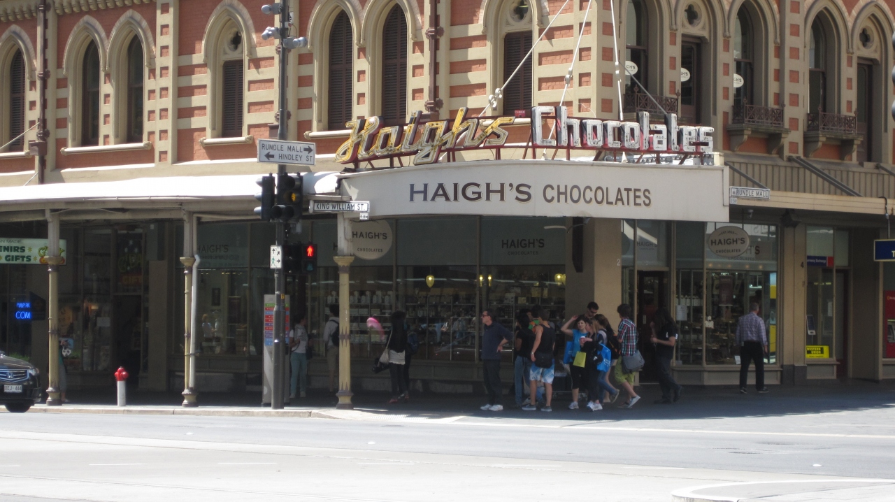アデレードと言ったら、オーストラリアのチョコと言ったら知る人ぞ知る、ハイグスチョコレート!キングウィリアムストリートを北上すると右手にクラシカルなお店が見えて来ます。それこそハイグスのお店です。