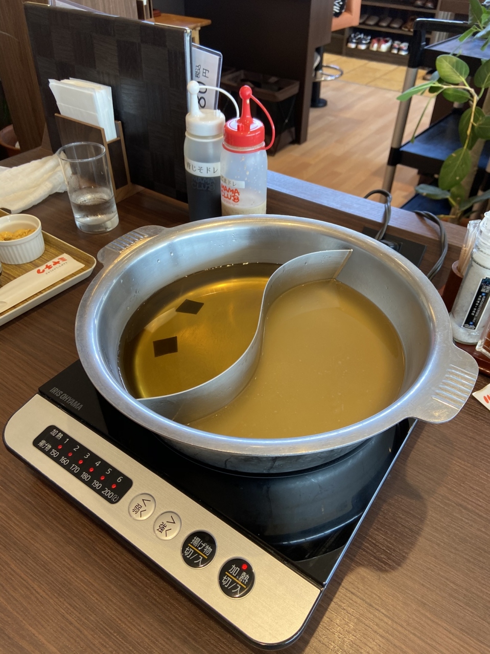今回の目的は、宮崎ブランドポークしゃぶしゃぶセット 1,980円 2名以上でないと頼めないメニューです。昆布の和風だしと濃厚地鶏塩だしの2種類が一つの鍋で出てきます。野菜もセットでついてきます。ロースとバラ肉が半分づつきます。 しゃぶしゃぶすると肉の甘みを強く感じます。あっさりとした脂です。出汁もよい感じです。ポン酢とゴマダレをつけて食べるようにしてくれてのですが、なくても美味しいです。肉のうまみがでており、肉自体が美味しいです。野菜ももちろん美味しいですが・・・