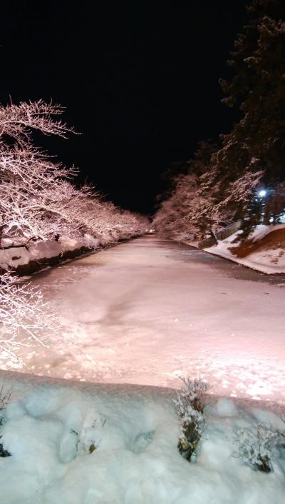 冬の弘前城公園の夜のライトが桜のように見えるというイベント(?)があっていて、立ち寄りました。写真を撮るのにとてもコツがいるのですが、ご覧のようにピンク色の夜桜のように見えますね?30分ほど立ち寄り一生懸命写真を撮りましたが、良いカメラがあったらもっと良く見えるそうです。春の弘前城公園に行ったことがないのですが、冬の弘前城、気に入りました。幻想的でした。