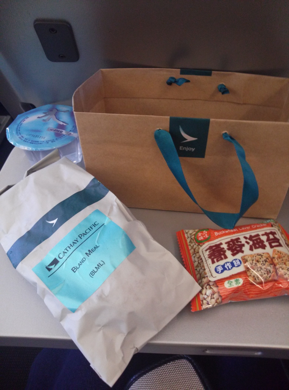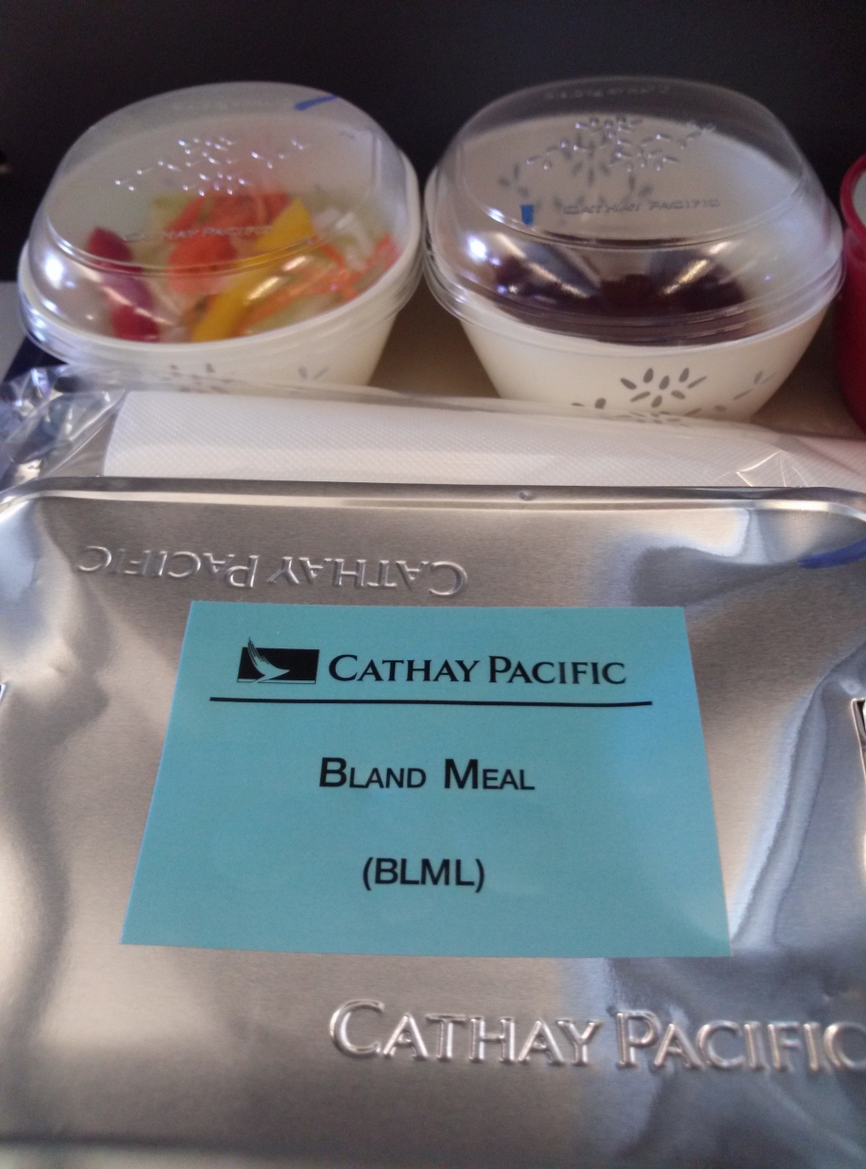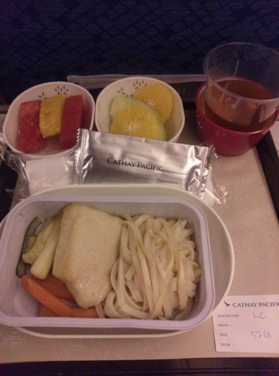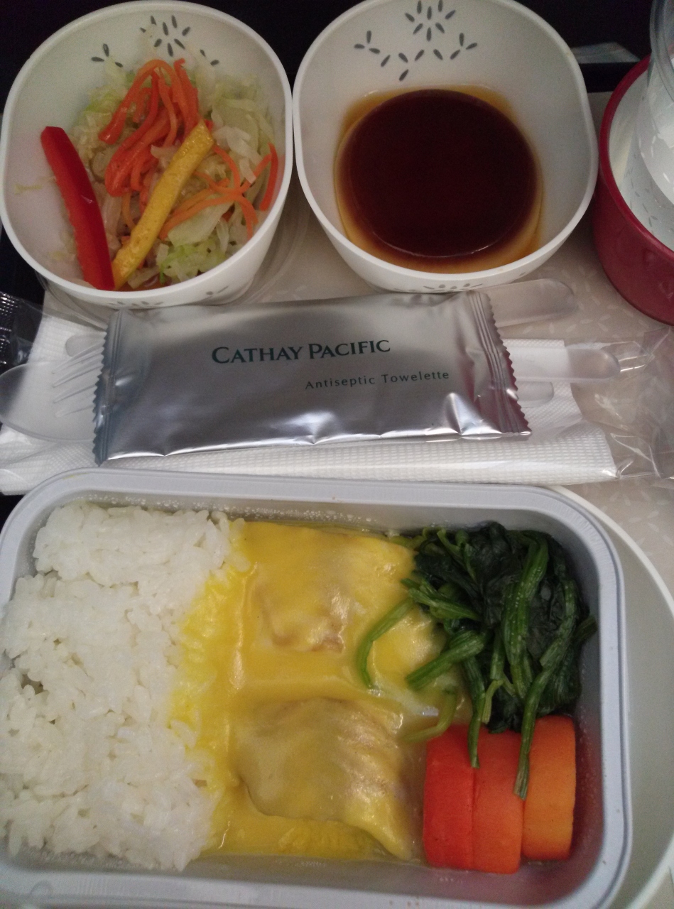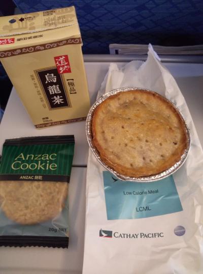 福岡から台北を経由して(便は同じです。1時間位部屋で待機します)行きます。福岡からの約1時間半で通常の機内食、台北から香港までは軽食でした。キャセイは特別食のサービスが沢山あると聞いていたので、いつも機内食はがっつり食べることができないので、今回は往路=胃にもたれない食事、復路=低カロリー食をリクエストしました。