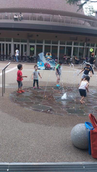 小さな噴水?のような水が噴出してる場所があり、たくさんの子どもたちが水で遊んで、時にはびしょぬれになっていました。着替え必須です!