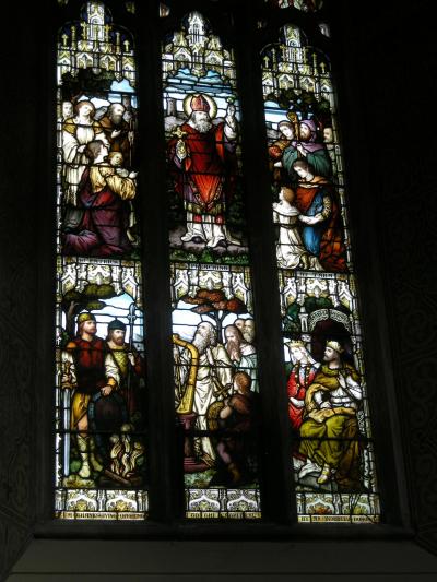 周囲のステンドグラスを見て回っていると、手にシャムロックを持つ聖パトリ...
