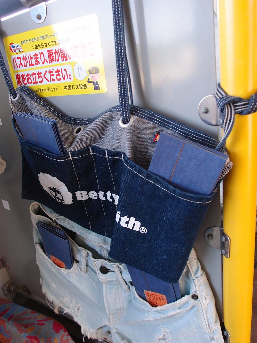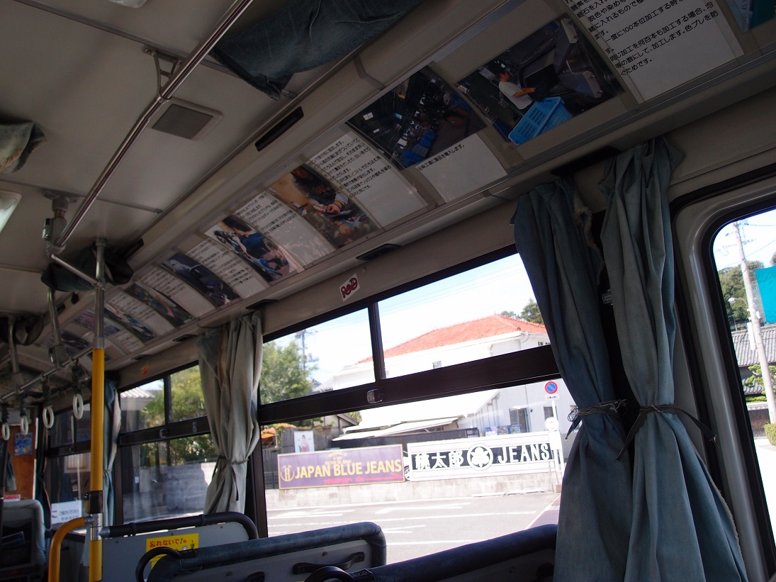 椅子もカーテンもデニム生地、ジーパンが飾られ製造工程の紹介が掲示されすごいです。乗車中あれこれと眺めて楽しい移動時間を過ごすことができました。