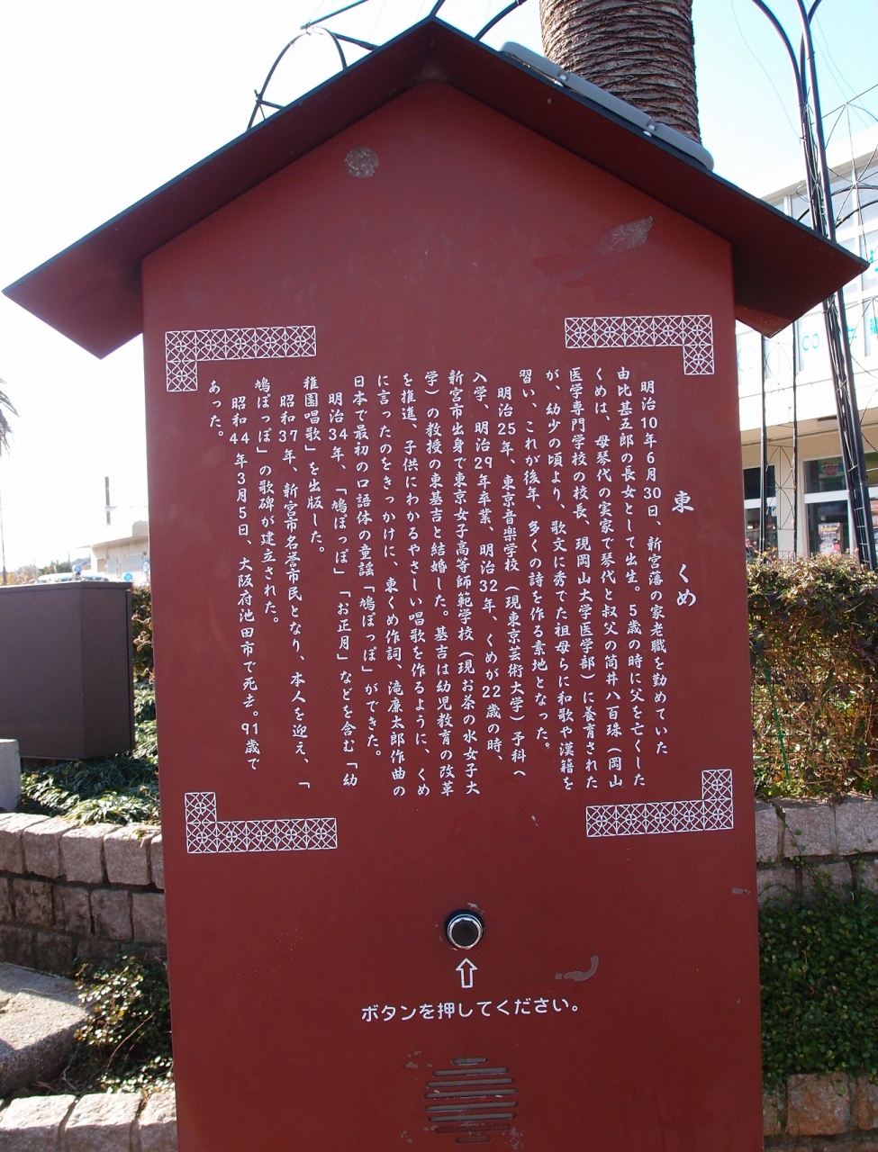 鳩ぽっぽという歌は知らなかったのですが、童謡「お正月」も作詞されているという東くめさんについて、知ることのできる看板がこの歌碑近くにあります。