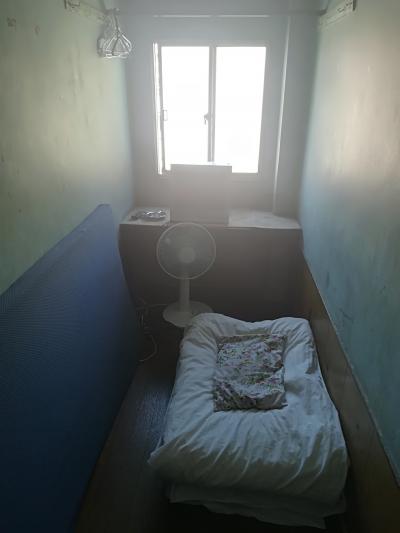 最安値のテレビなしシングルが900円から千円に、テレビありが千円から1100円に値上げされたようだ。3年前に利用したときは、ひとつしかない風呂が、誰もいないのに、「女性使用中」のままになっていて、待たされたが、現在は、男性のみ利用でき、女性は別のシャワー室を使うように改善されていた。これは評価できる。トイレもきれいで、部屋にはマットもあった。1階でカップ麺も作れるし、お茶も飲める。非常階段の向こうにあべのハルカスが見えた。エレベーターが奇数階にしか止まらないので、部屋が偶数階の場合は、奇数階から階段を使う。