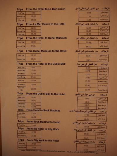 ドバイモールやドバイ博物館など、ホテルから無料シャトルバスが出ていて、ホテルの入口に時刻表が置いてありました。本数はあまり多くはないですが、時間を合わせて活用すれば便利だと思います。