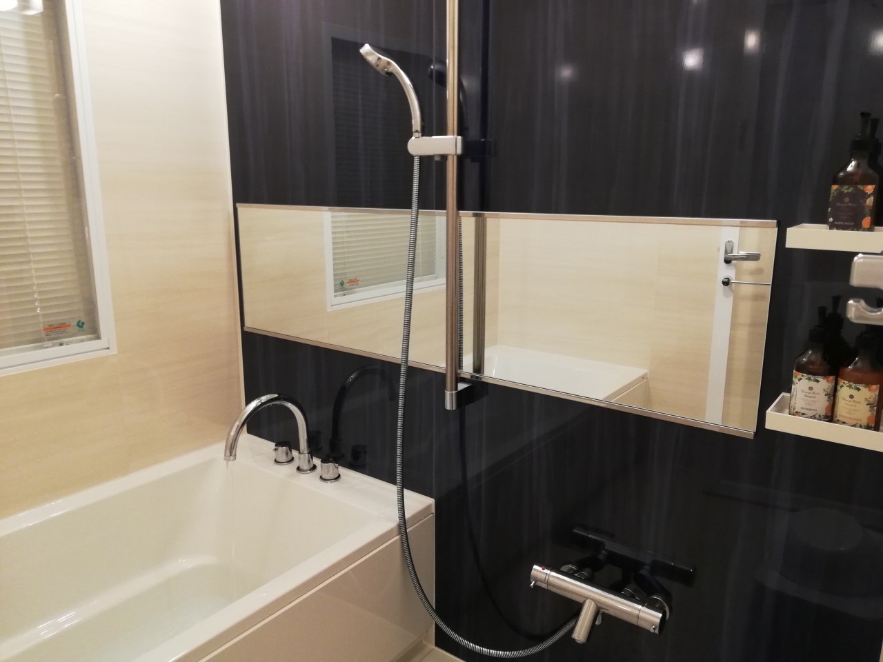バスタブのあるバスルーム、洗濯機があり、これで乾燥機があれば文句ありません。