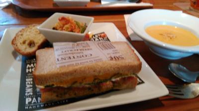 私がいただいたのはカレーペーストとお野菜・卵などを挟んだカレーのサンドイッチセット。スープやサラダ・ちょっとしたデザート付き。