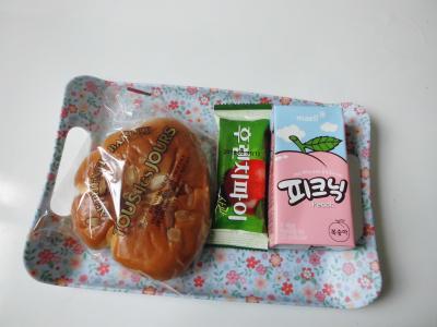朝9:00頃にパン+パックジュース+パイ菓子がトレイに乗せられてもらえます。