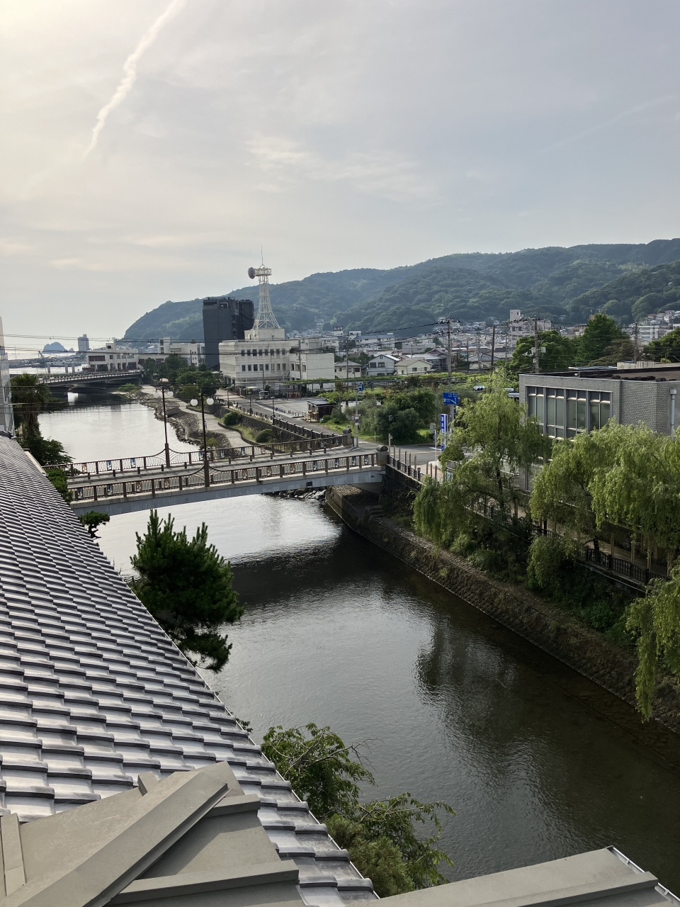 伊東大川沿いにあり、隣は伝統的和風建築として有名な東海館があります。