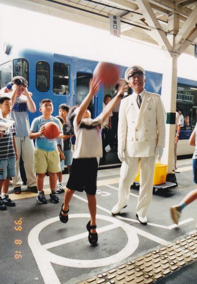 五能線能代駅のホームにバスケットリンクがあり、リゾートしらかみで行くと停車時間にフリースローゲームがある