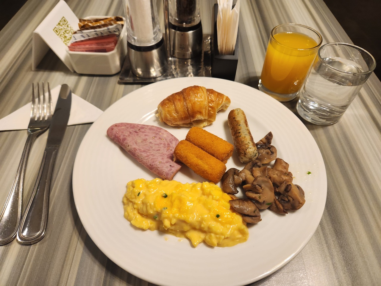 朝食は洋食を選択、白いオムレツということで期待していましたが味は普通のオムレツでした。パンがおいしかったです。余ったデニッシュは持ち帰り用の袋が用意されていました。