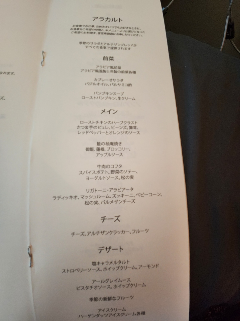 乗務員は、日本語が話せるCAが1名搭乗していたようですが、ビジネスにはおらず、英語でのオーダー。タッチパネルで注文できると良いのに。