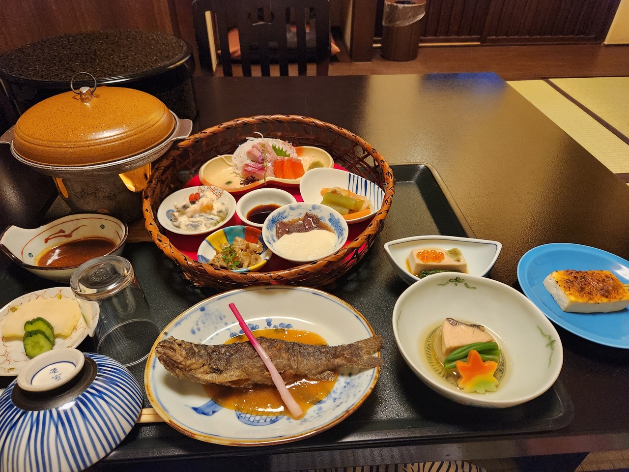 食事は朝夕とも部屋食でしたが、食事処になる場合もあるようです。量も多すぎず地のものを満喫できるメニューです。