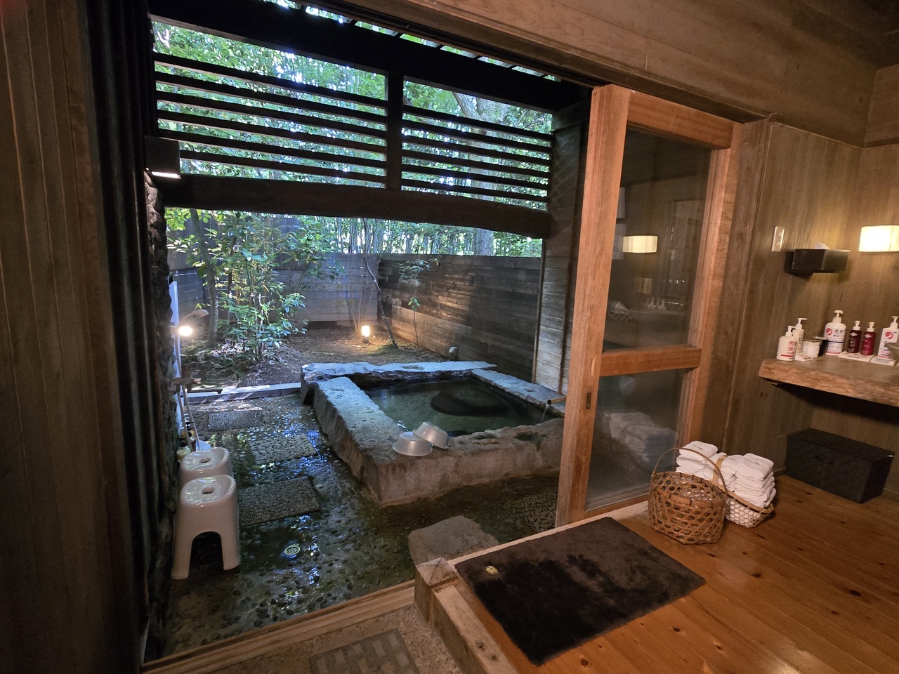 源泉かけ流しの露天風呂付のお部屋がある温泉旅館です。洋風の部屋があったり、夕食も和洋折衷だったりとあえてryokan表記にしているのもそのためなのかなと思いました。